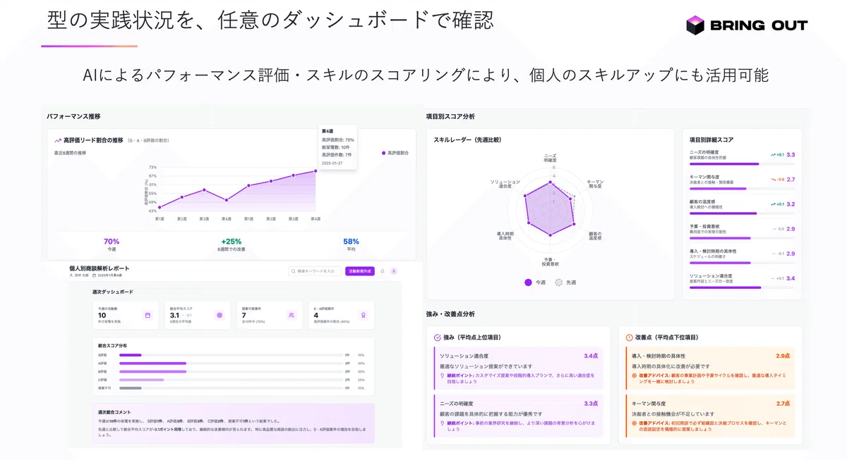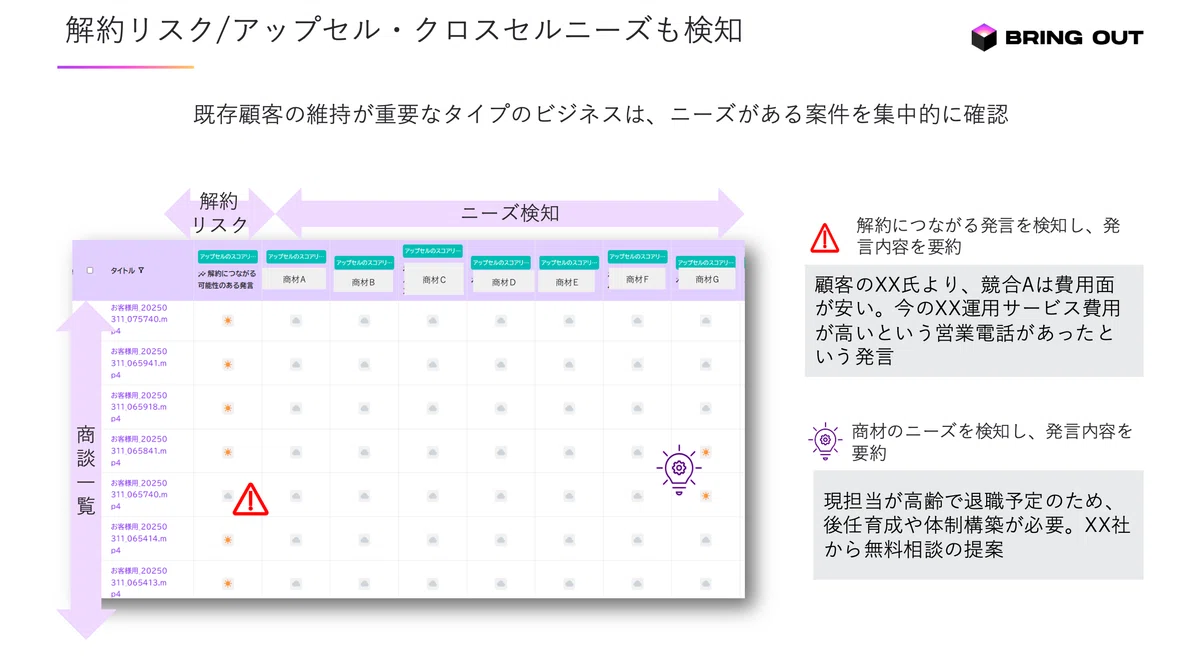 COO 林: ある大手企業では毎月数千件の対話データ(商談、開発会議、経営会議)をBring Outに流し込んでいただいています。 そこから、