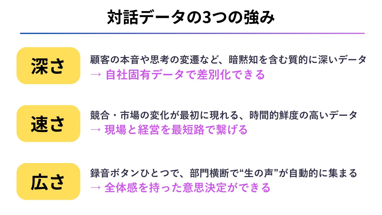 COO 林: 対話データが優れている理由は「深さ」「速さ」「広さ」の三拍子を満たす点です。 「結果」ではなく「なぜその結果になったのか」まで分かる深いデータが、現場の最前線からリアルタイムで供給され続けます。しかも、営業など特定部署のみならず、開発や財務など各部署が今話していることを拾い上げ、会社全体のコンテキストとして捉えることができる。 つまり、「すべての商談や社内会議に出席し、顧客の声も現場の声もすべて把握する」といった状態をAIに作ってあげることが、対話データを通じて実現できるんです。