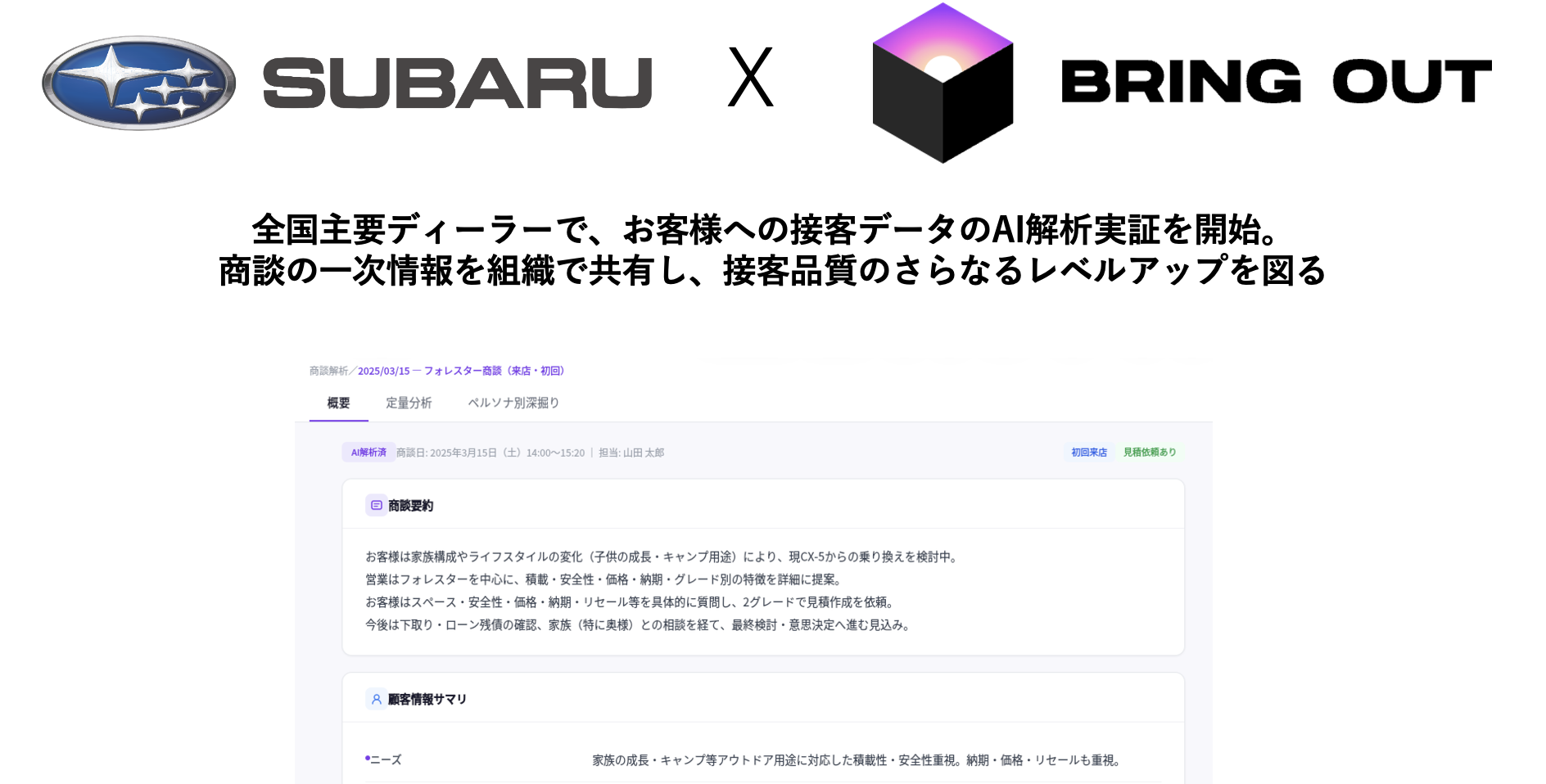ブリングアウト株式会社(本社:東京都、代表取締役:中野 慧、以下「当社」)は、株式会社SUBARU(以下、SUBARU)が推進する販売・接客改革の一環として、当社が提供する対話データを起点とした経営変革プラットフォーム「ブリングアウト」について、PoC(概念実証)での成果を踏まえ、全国150以上の店舗/1,000名以上の方が参加する大規模なトライアルフェーズへ移行することを決定しましたので、お知らせします。