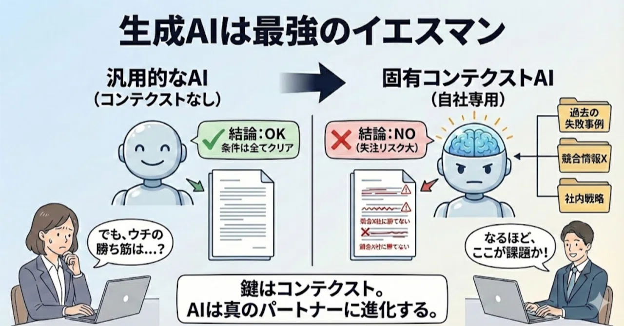──でも、経験のある管理職は、この会議の報告を聞いた瞬間に違和感を覚えます。 案件の情報は間違ってない。確かに生成AIの答えは正しい。それでもこれが本当にホットな案件かというと全然そうは思えない。 なぜでしょうか。理由は単純です。一般的に正しいということと、この会社にとって正しいということは別物だからです。 ここで整理されているのは一般論として商談に必要とされる条件が整っているかどうかだけです。 「ウチの会社にとって勝ち筋があるか」「過去の失敗と同じ構造ではないか」 そうした問いには答えていません。 もちろん、こちらがその情報を与えていないからでAIは何も悪くありません。 生成AIは間違えません。ただし、あなたにとって価値がある答えを出すとは限りません。 生成AIは、最強のイエスマンなのです。 既視感のある光景──これは、「優秀な新人が入社してきて会議の中で正論を主張し、それを(あったなぁ。。ああいう時。)と、温かい目で周りが見つめている」光景とよく似ていると言えます。
